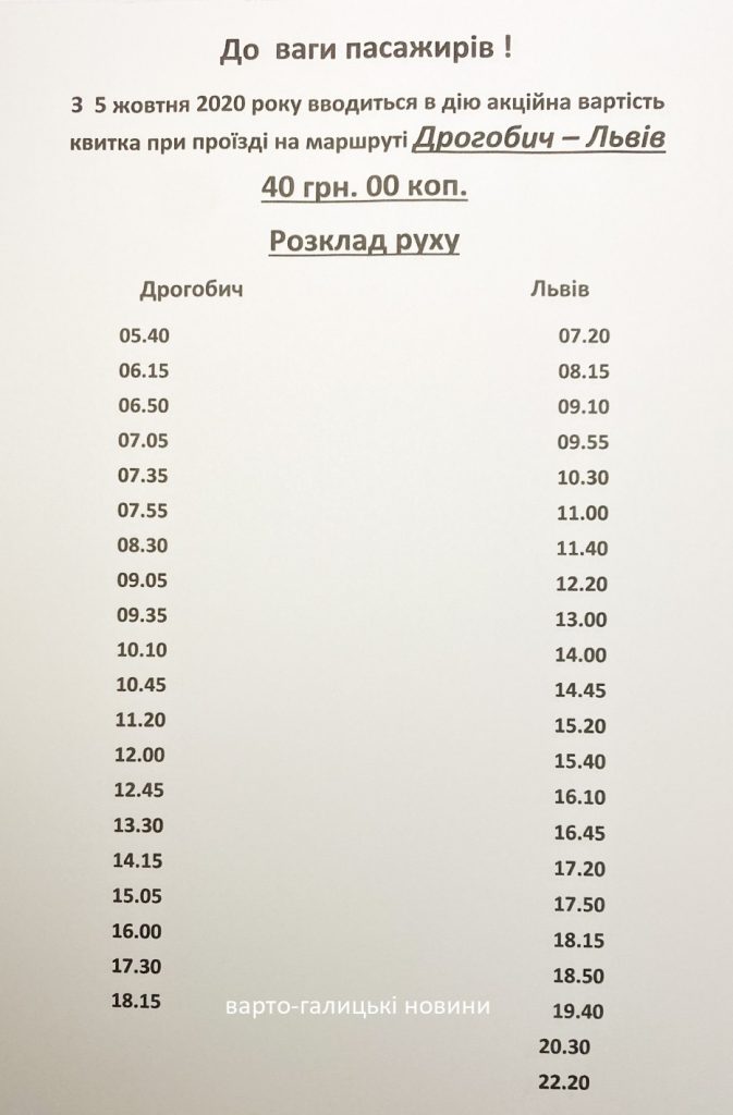 З понеділка, 5 жовтня, автобуси «Дрогобич – Львів» та «Львів – Дрогобич» їздитимуть по акційній ціні – 40 грн.
