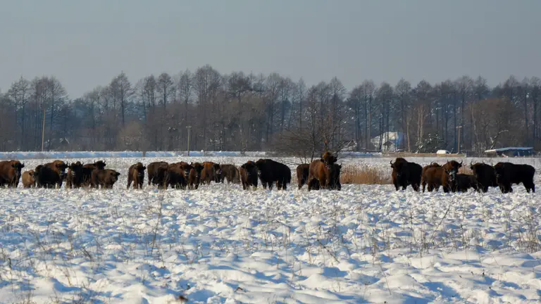 Цими днями засніженими полями та луками Золочівського району Львівської області бродить стадо справжніх велетнів — європейських зубрів. Серед дорослих тварин можна побачити й маленьких телят, які тримаються позаду своїх матерів.