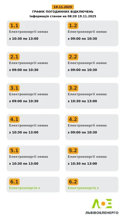 Вранці 19 листопада на Львівщині запровадили графік погодинних вимкнень електроенергії. Цьому передував ранковий масований ракетно-дроновий обстріл. Згодом повідомили про аварійні відключення електроенергії.
