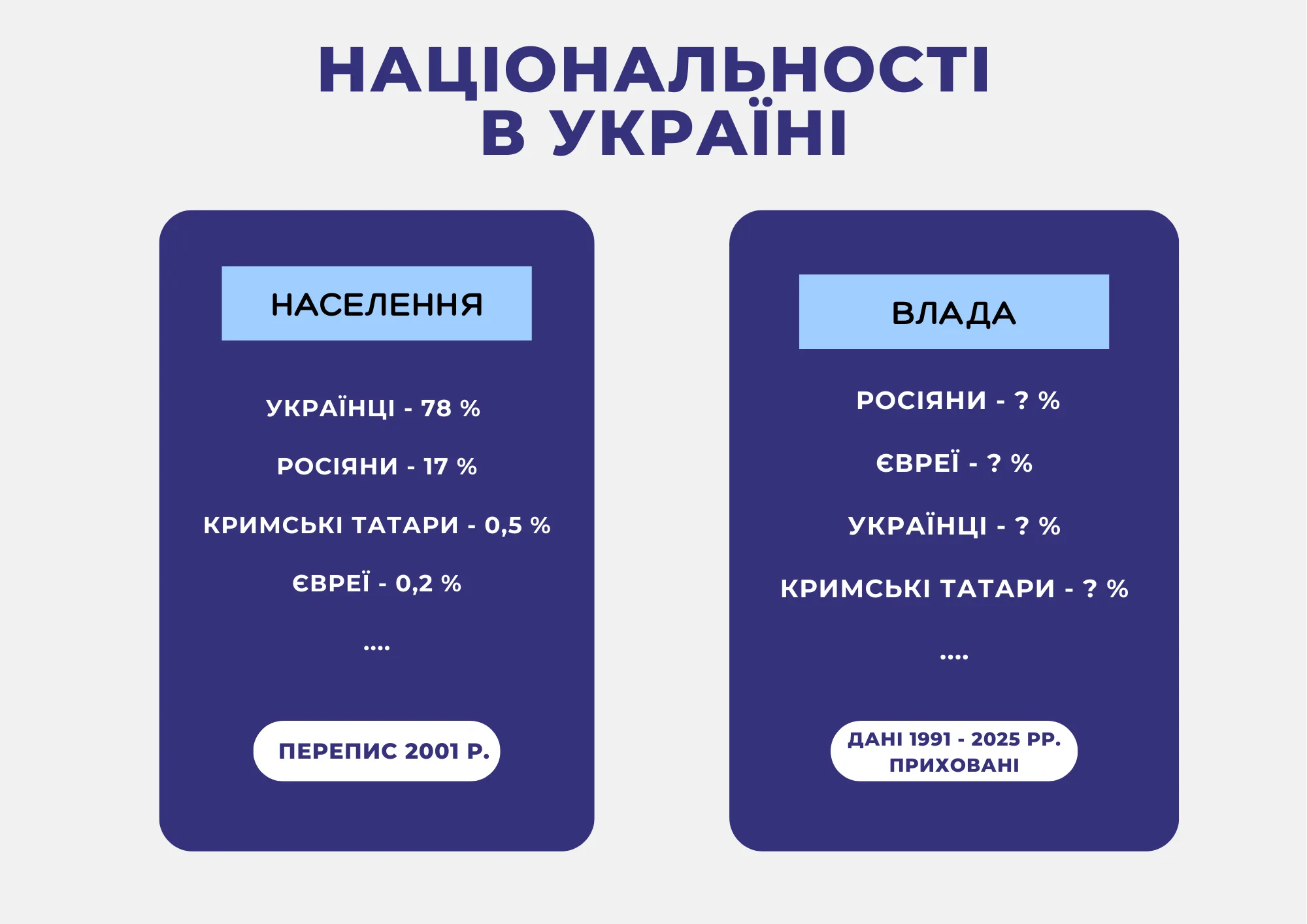 Звідси напрошується простий, але логічний висновок. Сьогодні, коли йде війна за саме існування української нації й під загрозою перебуває молода українська державність, ми українці не маємо права нехтувати питанням національності. Не дарма, навіть в Конституції України зазначено, що не може бути привілеїв чи обмежень за етнічною ознакою. Тим паче, що за визначенням ЮНЕСКО Україна є моноетнічною державою – українці складають понад дві третини населення. Тому й українці мають домінувати у всіх органах влади та бізнесу. А для забезпечення цієї норми представництва законодавчо слід закріпити вимогу для кожного, хто претендує на керівні посади в органах влади або вже обіймає їх чи має намір балотуватись до рад різних рівнів чи володіє великим бізнесом – зазначати в анкетах свою національність, попередньо довівши це походженням своїх батьків, дідів та прадідів. Оприлюднення таких даних стане запорукою демократії, себто влади українського народу, де українці за національністю відповідно до перепису населення 2001 року складають 78 %.
