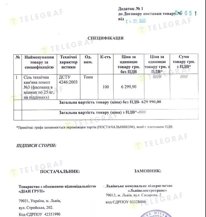 У січні комунальне підприємство «Львівелектротранс» уклало договір на закупівлю 100 тонн технічної солі. Вартість однієї тонни склала 6299,9 грн без ПДВ — це найвищий показник серед проаналізованих зимових тендерів.