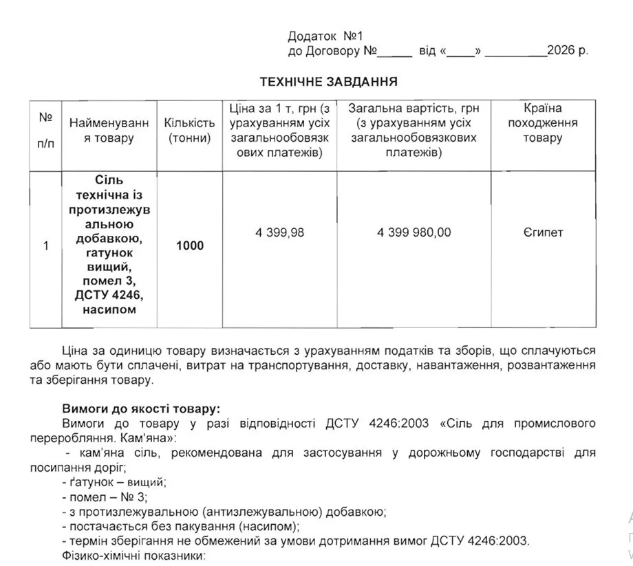 Постачальником стала місцева компанія ТОВ «Діан Груп». Згідно з договором, сіль постачається у мішках по 25 кг на піддонах. Інших специфічних вимог — наприклад, підвищеного класу очищення чи спеціальних добавок — не зазначено.