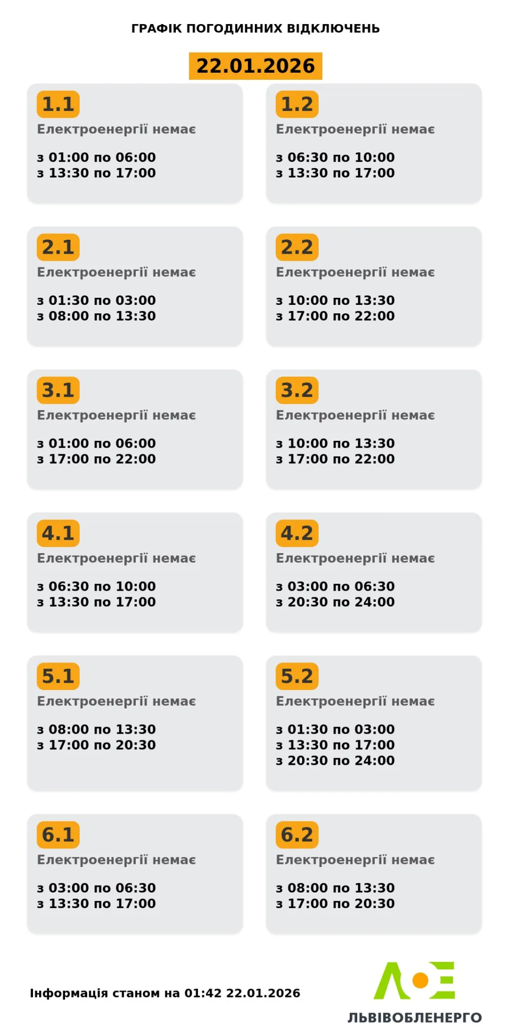 У четвер, 22 січня, у Львові та на Львівщині будуть діяти графіки погодинного відключення електроенергії.