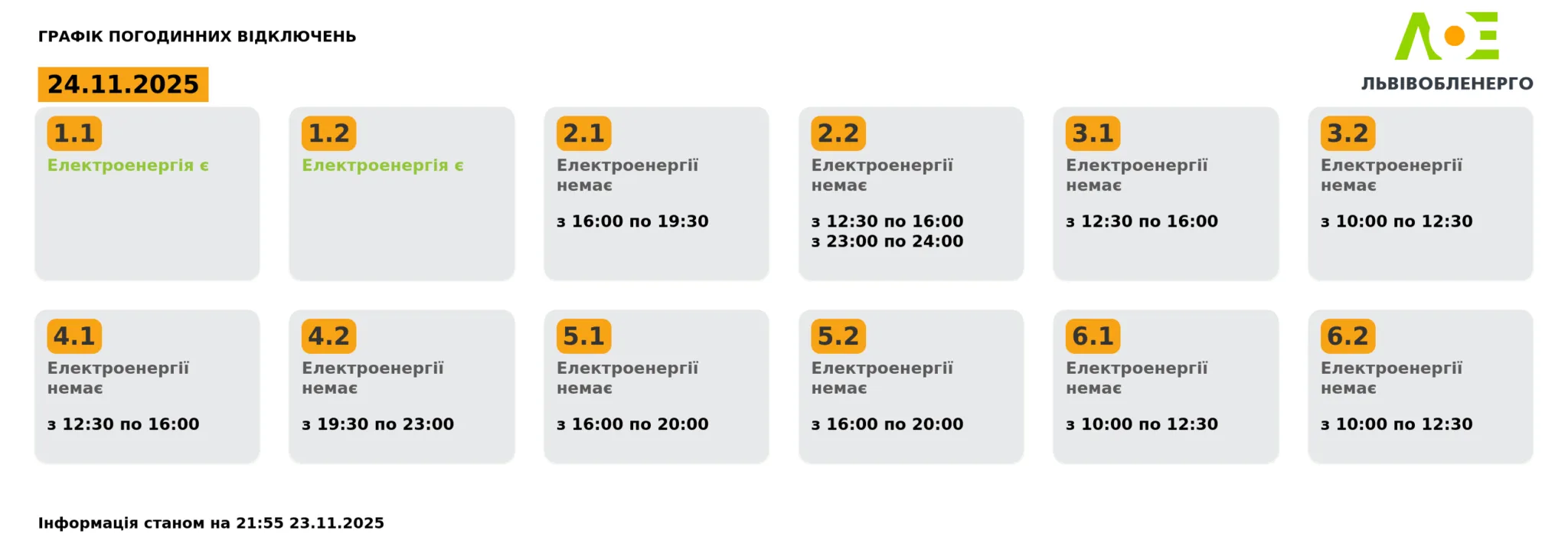 Графік відключень електроенергії у Львові та області на 24 листопада