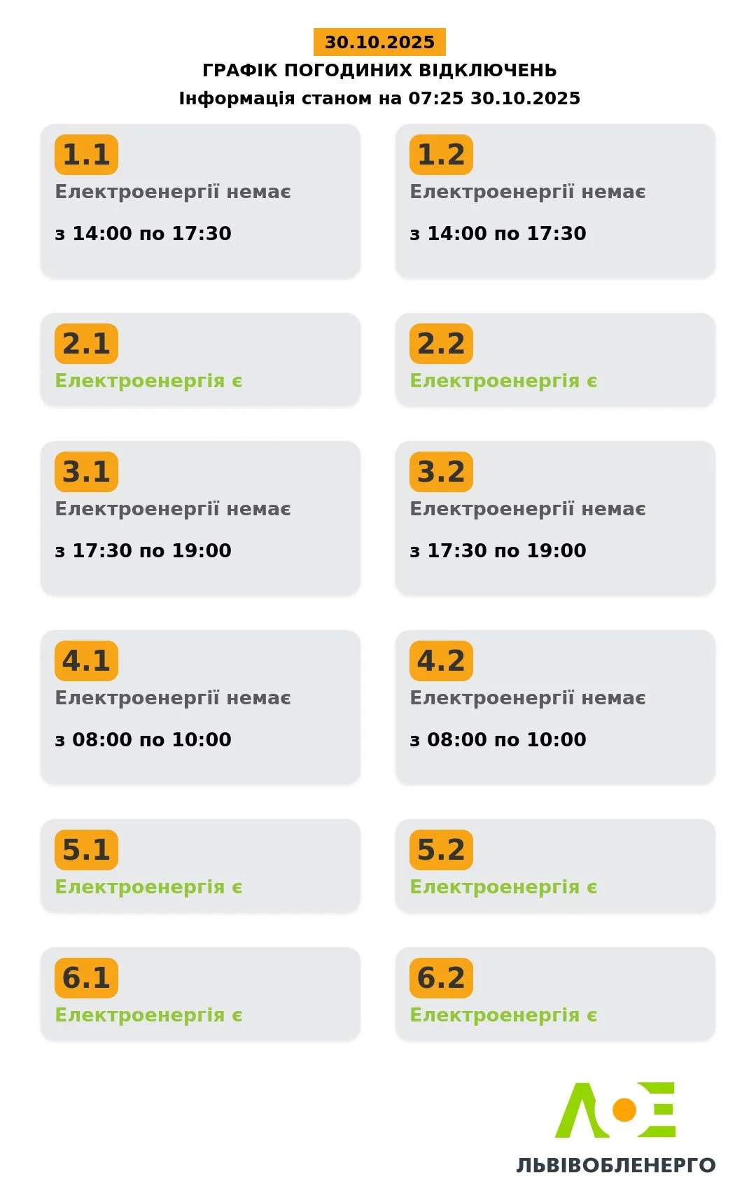 У четвер, 30 жовтня, через російську атаку на українську енергетику на Львівщині запровадили графік погодинних відключень світла.
