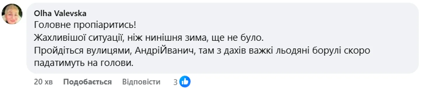 Зокрема, користувачка Olha Valevska звернула увагу на небезпеку льодових бурульок: