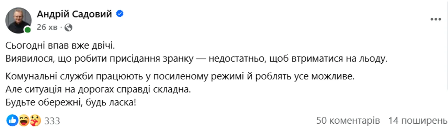Міський голова Львова Андрій Садовий повідомив, що через ожеледицю двічі впав на вулицях міста. Про це він написав 4 лютого на своїй сторінці у Facebook, звернувши увагу на складну ситуацію з обледенінням доріг та тротуарів.