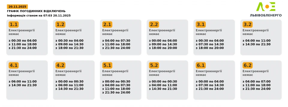 Група 4.2. Електроенергії немає з 00:00 до 00:30, з 06:00 до 11:00, з 14:30 до 21:30.