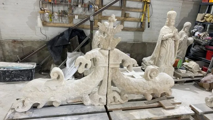 Реставратори вже укріпили фігури дельфінів, заклеїли тріщини та заповнили дрібні пошкодження спеціальними мінеральними сумішами. Більші втрати каменю відновлюють за допомогою вапняку з місцевих родовищ.Над фігурами короля і лицарів також провели багато роботи: склеїли частини, заповнили щілини та укріпили слабкі місця. Щоб скульптури могли стояти вертикально, для них виготовили спеціальні опори.